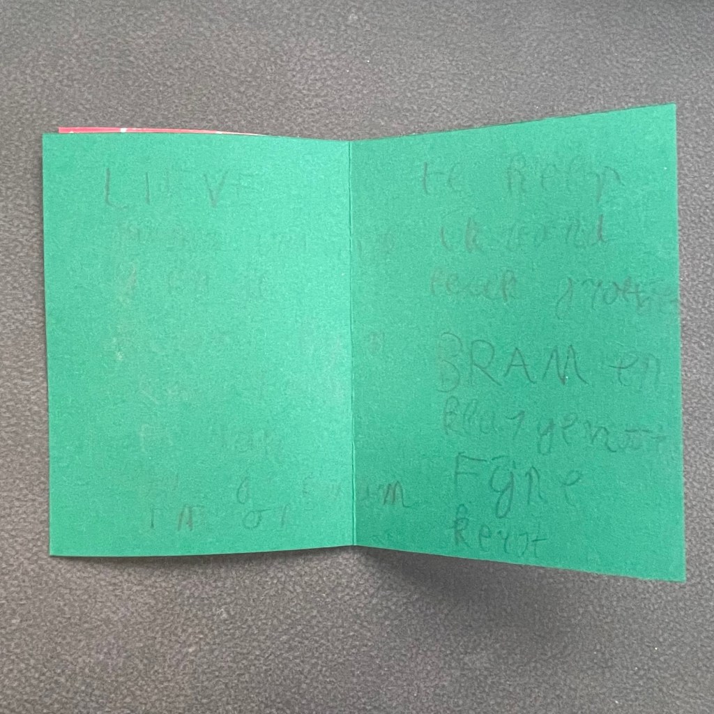Op het einde kwam er een jongen naar mij toe en zegt: deze kaart heb ik voor jou gemaakt! Ik was gewoon ontroerd, zo lief! En ook een heel stuk binnen in de kaart geschreven. Dankjewel Bram!
