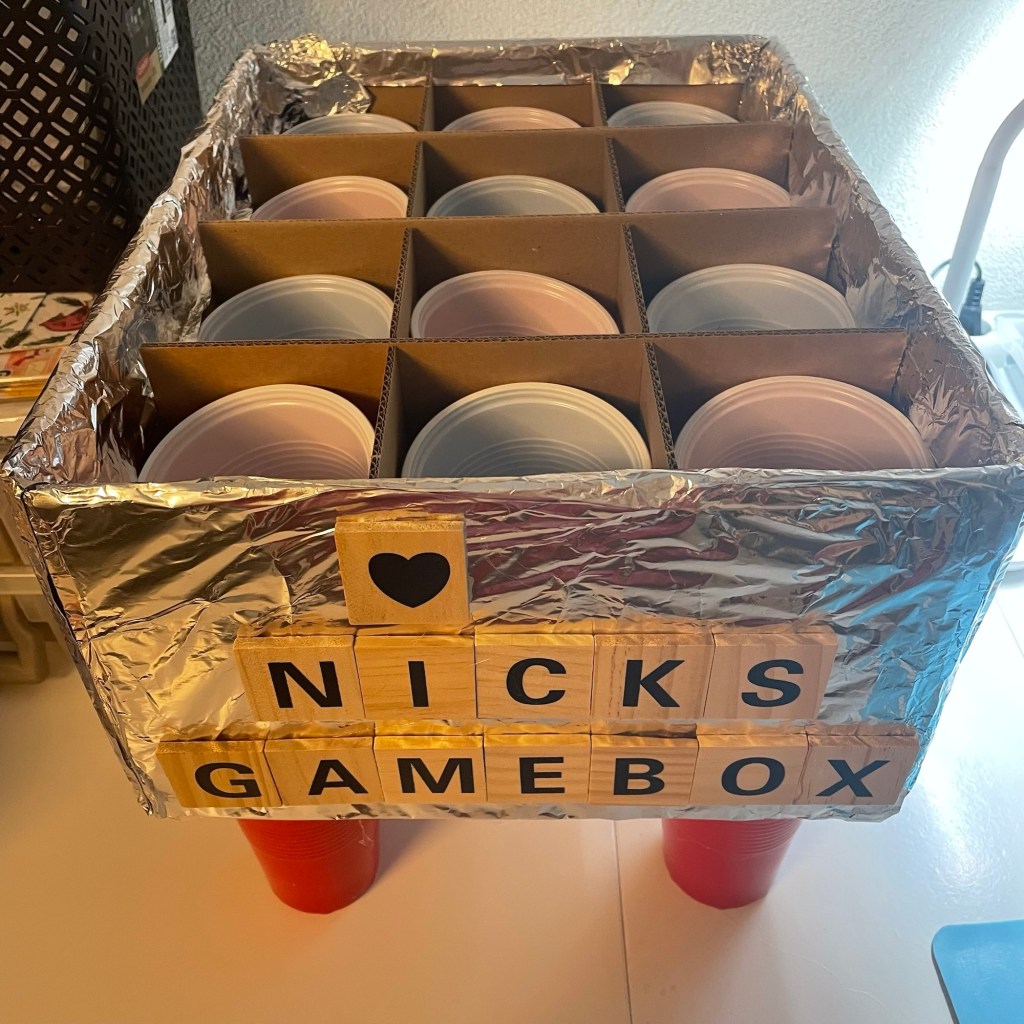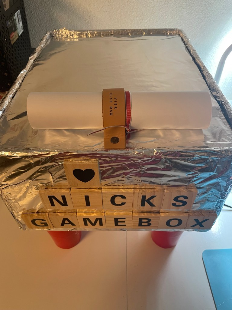 Ik maakte deze Gamebox. Nick moest pingpong balletjes in bekers gooien en onder de bekers zaten nummers die correspondeerden met cadeautjes: super gelachen.