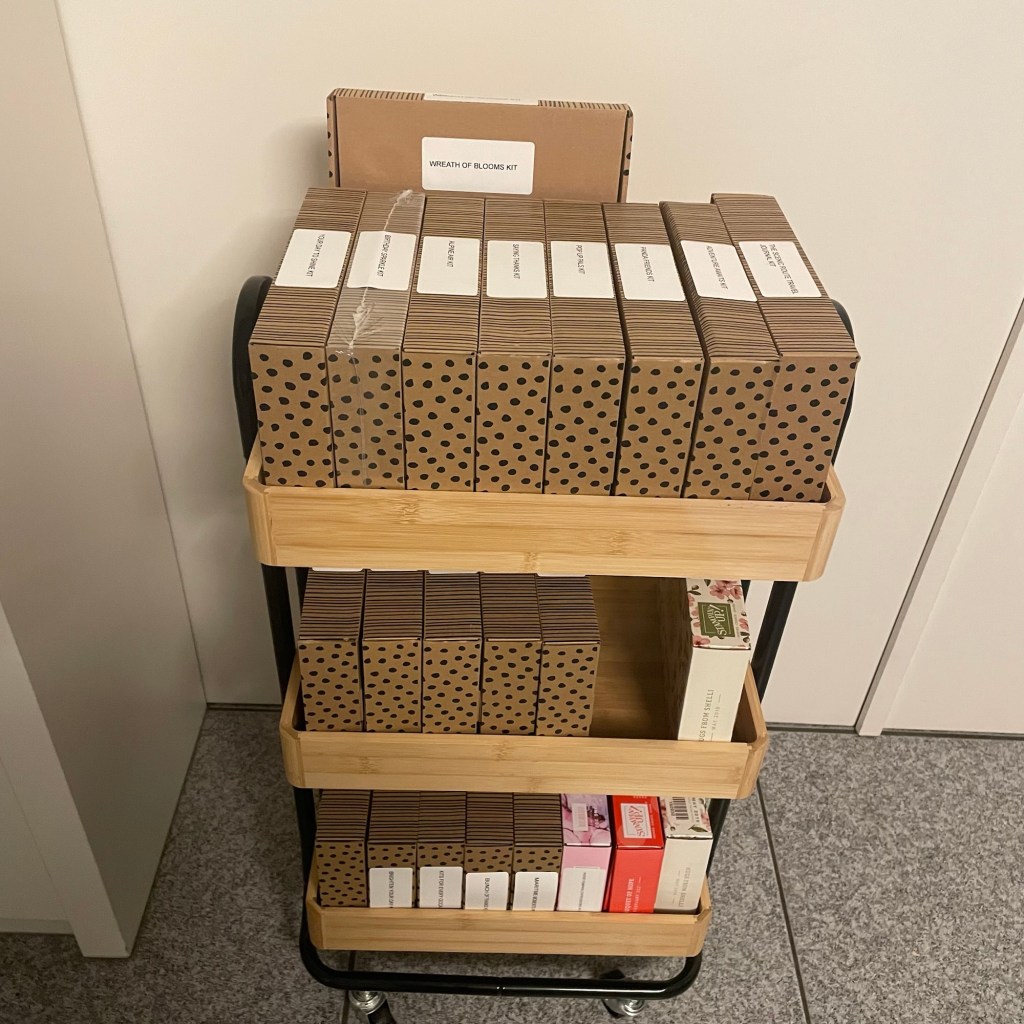 Als ze in de aanbieding zijn koop ik er altijd bij. Nu ben ik heel erg aan het opruimen en schrok toch wel hoeveel ik er heb. Er zitten ook cadeautjes tussen maar ik heb ook nog veel oude kits. Nu dus in een karretje gedaan in plaats van op twee plekken in twee kasten.