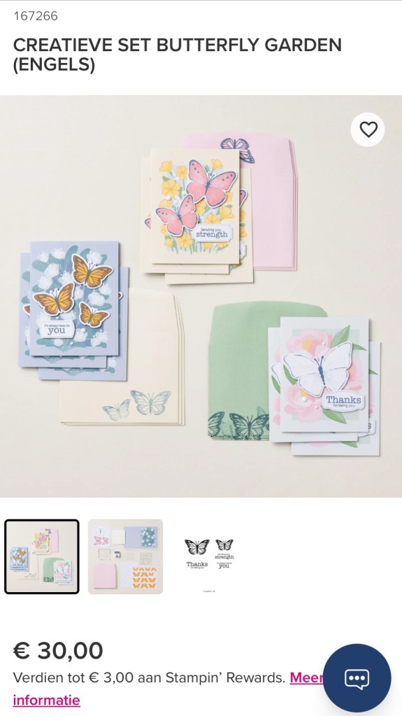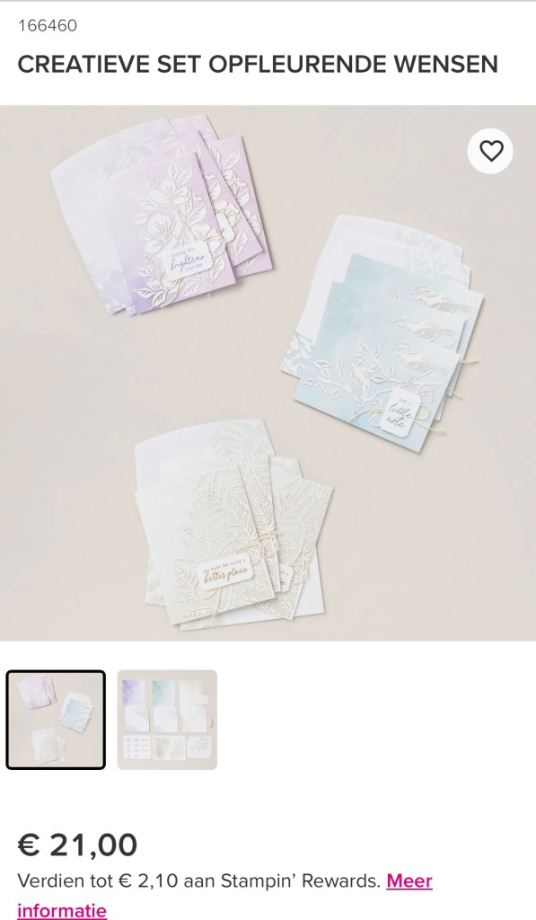 Deze is duurder omdat er stempels bij zitten, een stempelblok en stempel inkt. Je kunt dan 9 prachtige kaarten maken. Ik moet eerst wat sets opmaken van mezelf voordat ik deze mag kopen. En er komen in Maart weer prachtige nieuwe Online Only producten aan dus even doorsparen.