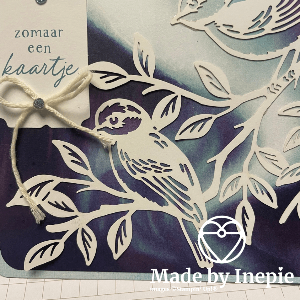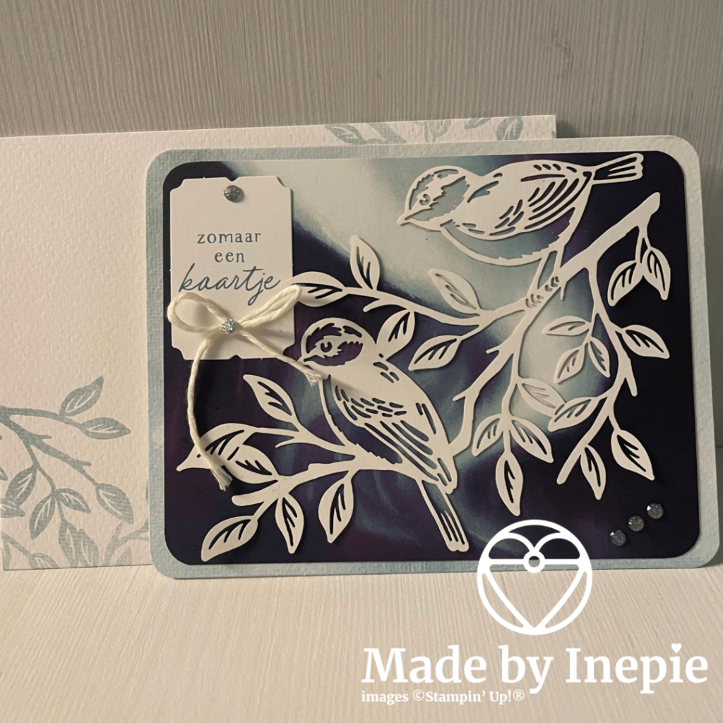 Dit papier vind ik zo prachtig. Ik heb de mat gesneden en toen de hoeken afgerond. En daarna de hoeken van de kaart ook afgerond. Zo komen de vogeltjes nog mooier uit.