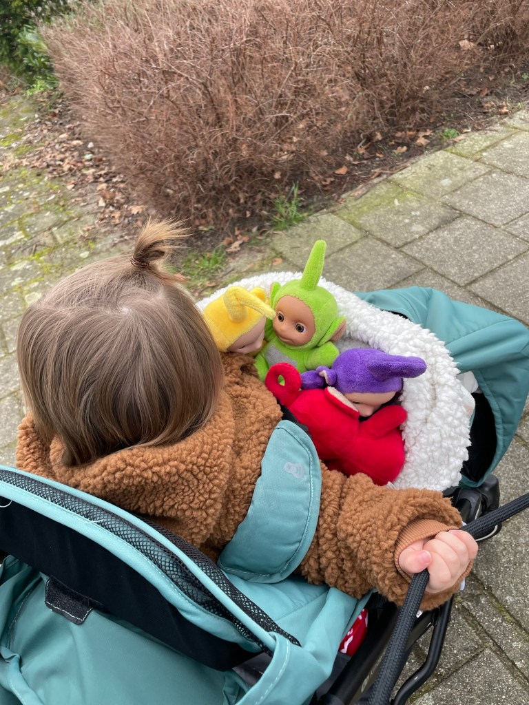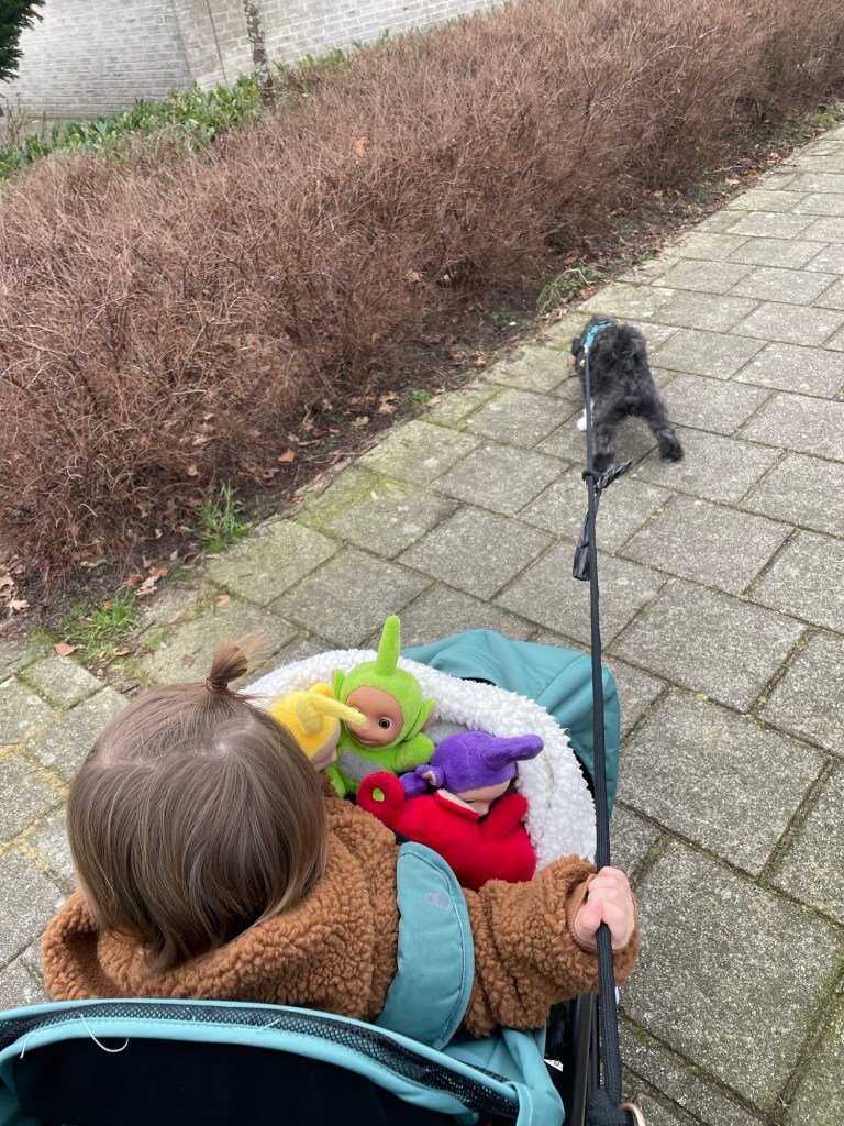 De Teletubbies zijn haar favorietjes bij ons thuis en vandaag mochten ze mee wandelen. En natuurlijk houdt zij Koda stevig vast. Dat ging goed totdat we thuis waren en ik zag dat we Po misten. Dus gauw teruggelopen en gelukkig is Po rood en zag ik deze liggen in het begin van onze straat. Pfffff.