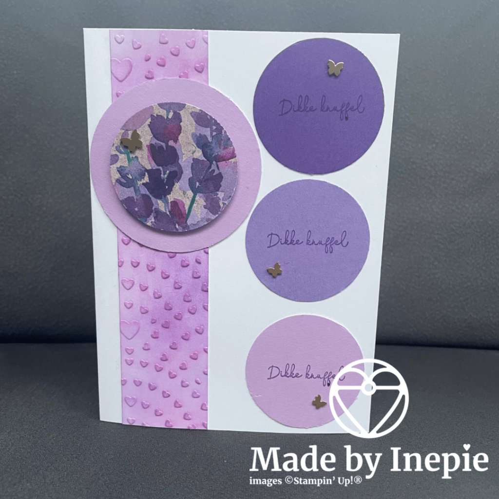 De lila banner heb ik ge-embossed met de mooie hartjes embosssing folder. Die je dus niet alleen voor Valentijnsdag hoeft te gebruiken. En het rondje Dsp is van het Lavendel Dsp. Een lief eenvoudig kaartje.
