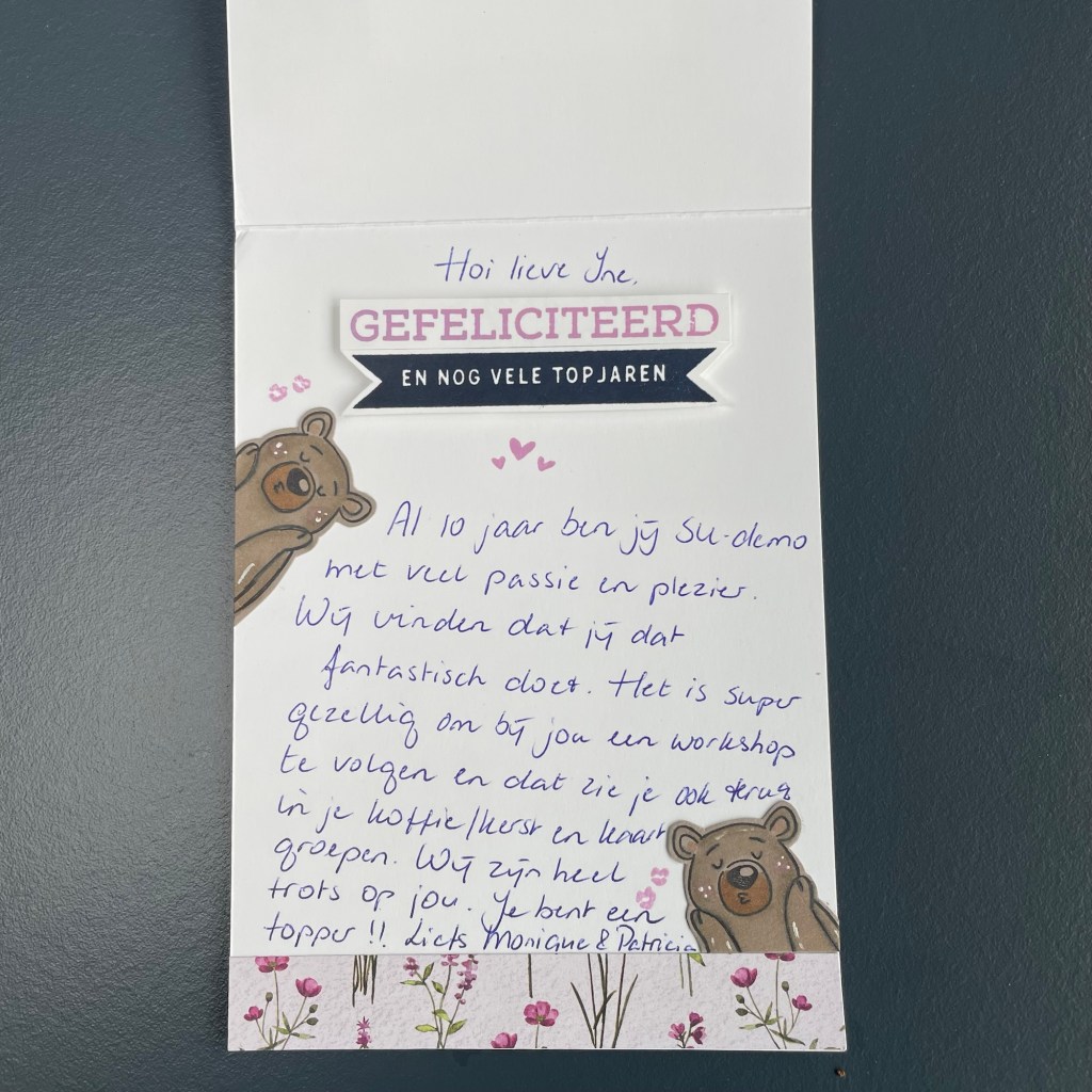 Zo super lief van mijn teamgenootjes Monique en Patricia. Er staat 8-10 jaar want officieel ben ik 8 jaar nu Stampin’ Up! Demo maar eigenlijk 10 jaar. Omdat ik uitgestapt was en opnieuw ingestapt ben omdat mijn toenmalige teamleider niks voor mij kon betekenen en Helene toen wel. En dan verlies je je titel en je jaren.