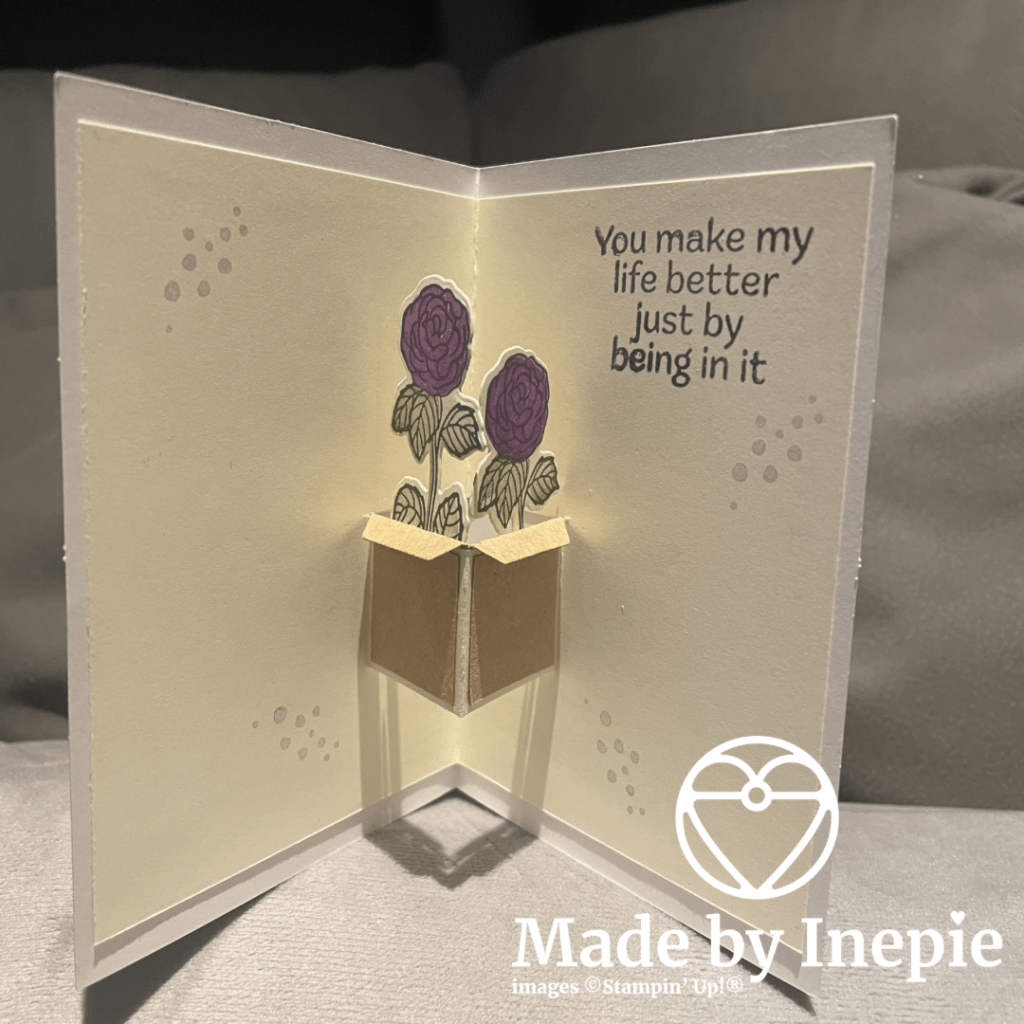 De binnenkaart heb ik van Very Vanilla gemaakt en daar dus de Pop-Up stans op gebruikt. Twee vierkantjes van craft papier gebruikt om het doos effect te versterken. Twee roosjes in de doos gedaan. En de teksten van deze bundel zijn zo mooi. Dus alleen een klein achtergrond stempeltje gebruikt.