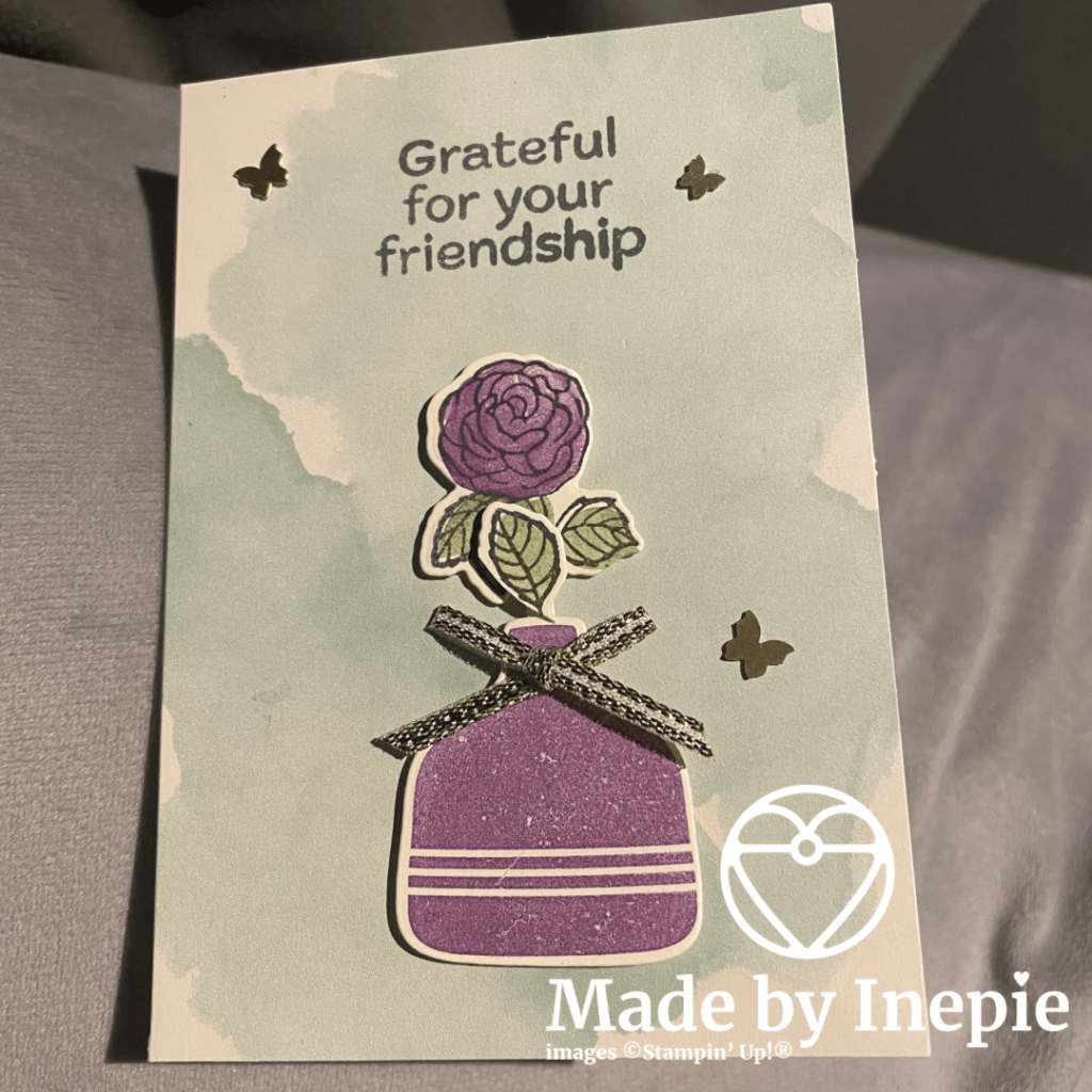 Als basis heb ik een oude Memory and More kaart en envelop gebruikt. En hierboven op de vaas en roos met Dimensionals bevestigd. Wat vlinders erbij en een gouden strikje.