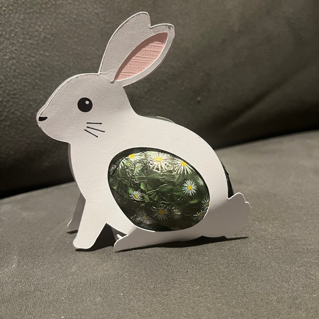 Hij stond al jaren op mijn verlanglijstje. Maar mijn twijfels en faalangst hielden mij tegen. Kan ik dit wel, gaat dit mij lukken? Ik ben niet zo handig op een computer. Ik zag steeds leuke dingen voorbijkomen: gemaakt met de cricut. Astrid een van de vaste Koffie en Kaart dames maakte dit schattige konijntje voor de Pasen voor mij: met haar nieuwe Cricut.