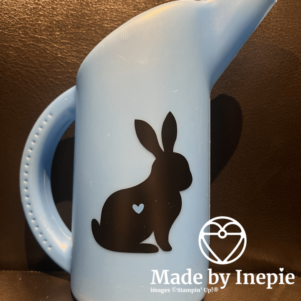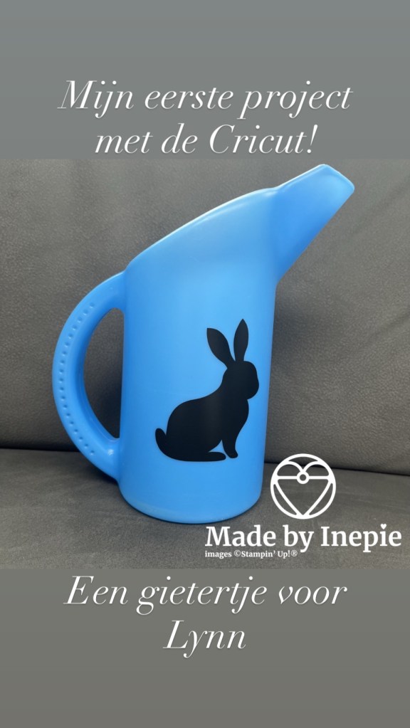 Yes het is mij gelukt om de drempel te nemen en achter mijn nieuwe beste vriend te gaan zitten. Ik zeg tegen mijn Koffie en Kaart en workshop dames altijd: het is maar papier. Dus dat zei ik ook tegen mezelf en ook” ik heb het nog nooit gedaan maar ik denk dat ik het kan”. En na de installatie en de testafdruk ben ik zo dapper geweest om een konijntje uit te laten snijden. Deze heb ik op een gietertje geplakt die voor onze Lynn is: