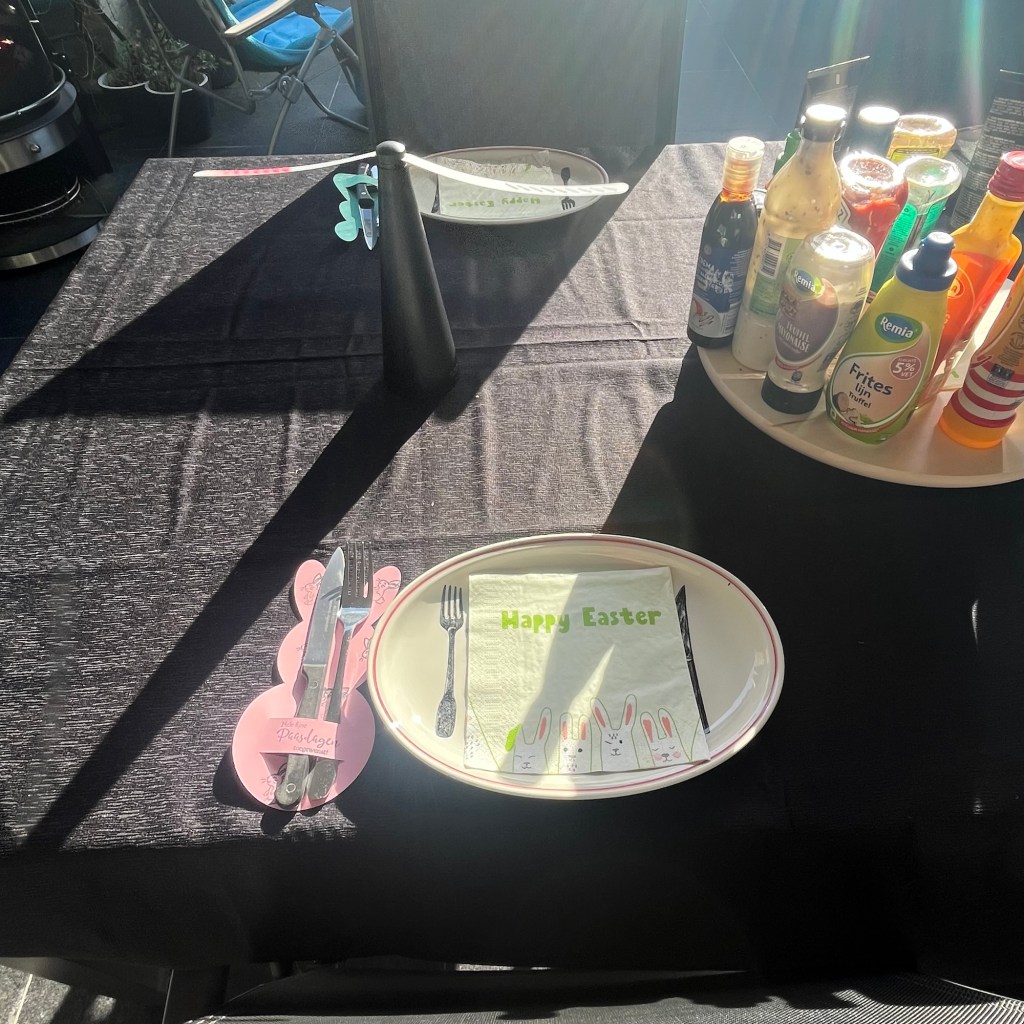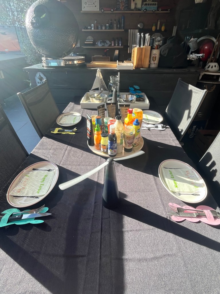 Tweede Paasdag kwamen Sam en Teun eten. Lekker ge-bbqed en natuurlijk had ik de leuke bestekzakjes gebruikt om de tafel te versieren.