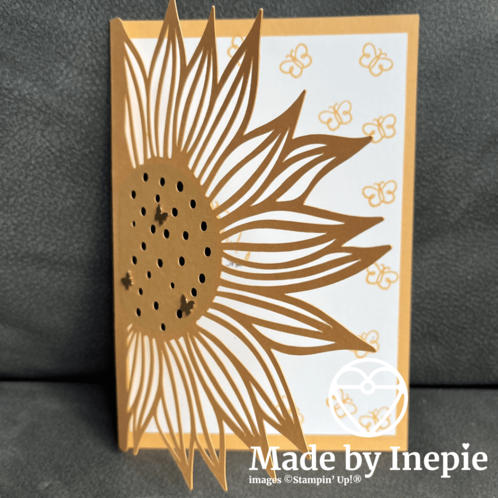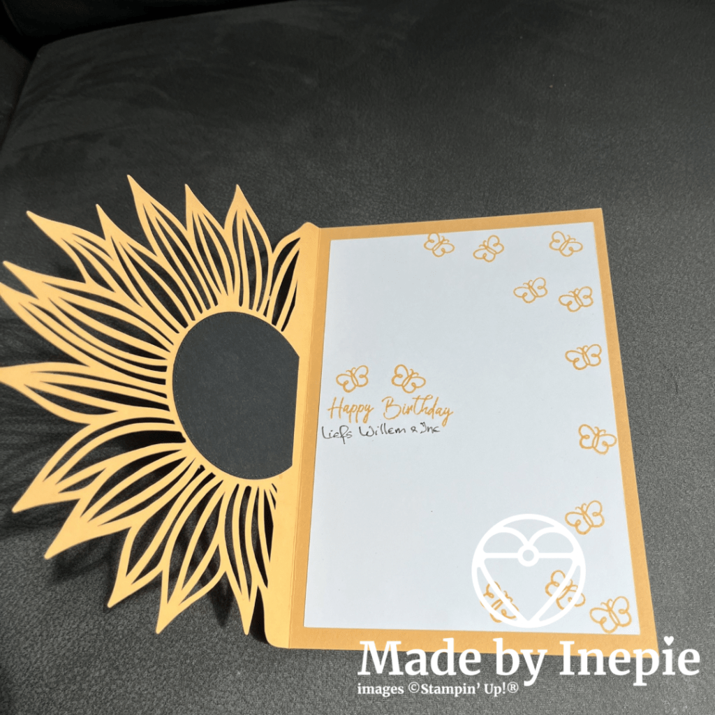 De Cricut sneed de zonnebloem uit en de basiskaart. Die maakte ik met Stampin’ Up! Peach Pie cardstock. Ook de witte binnen kaart sneed de Cricut uit Basic White cardstock. Ik was verbaasd hoe eenvoudig dit ging. Maar natuurlijk moest ik de kaart opleuken met Stampin’Up! producten. De vlinder stempels, de gouden vlindertjes, de Happy Birthday stempel: allemaal van Stampin’ Up! En ook de zwarte cirkel heb ik uitgestanst met een Stampin’Up! stans. Dit zodat je de gestempelde tekst niet zou zien door de gaatjes.