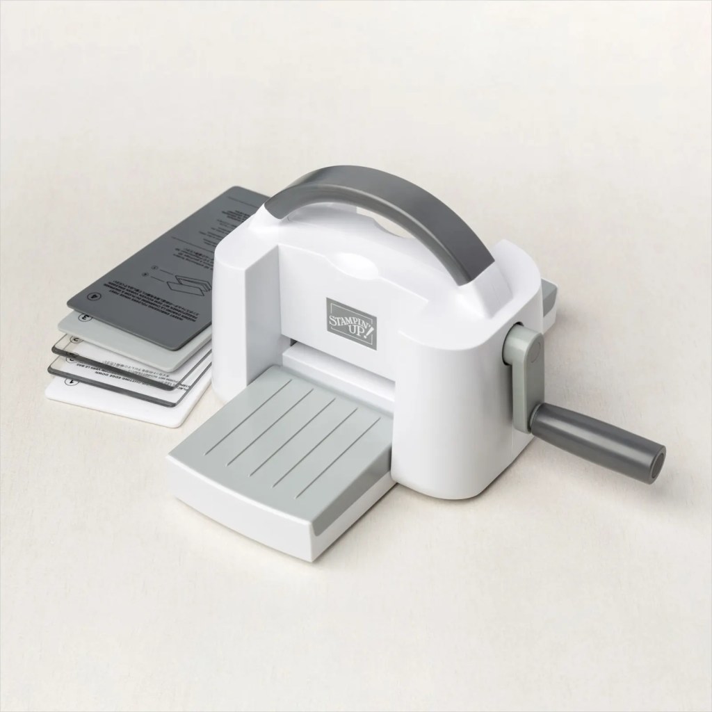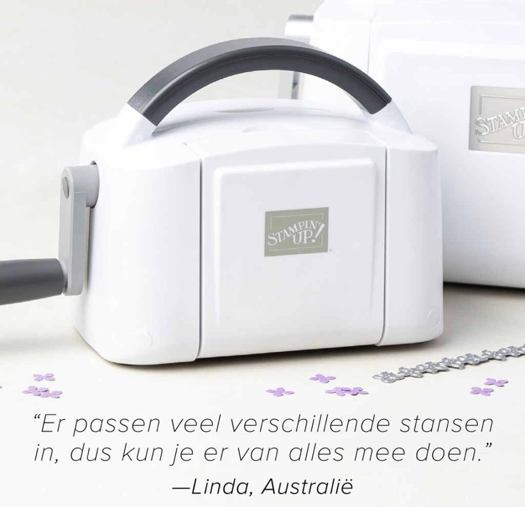 Eindelijk is hij er dan de nieuwe Stampin’Cut Emboss machine en het mooiste is er zijn twee uitvoeringen : een gewone en een miniuitvoering! Geweldig toch. Je vindt beide uitvoeringen op pagina 80 in de jaarcatalogus.